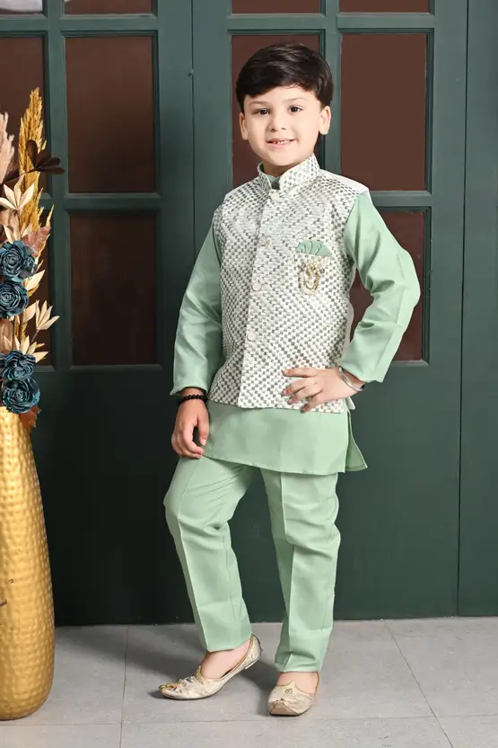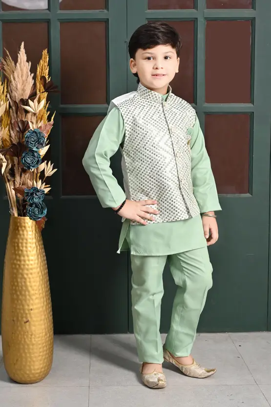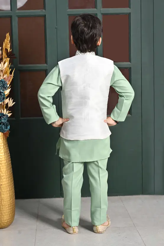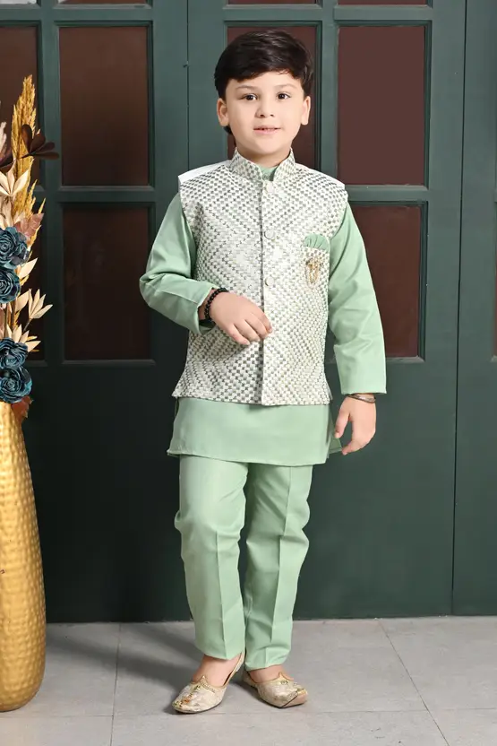 Boys Festive & Party, Wedding Kurta, Waistcoat and Pyjama Set (Green Pack of 1) quantity